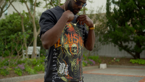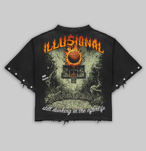 The Inferno Dunk Tee from Dark Illusion symbolizes the Hermetic Principle of Vibration and Polarity, capturing the eternal dance between life, death, and transcendence. Featuring a hauntingly vivid skeleton ascending fiercely towards a flaming basketball, this piece boldly visualizes the mastery of one's internal energies and the unending cycle of rebirth and transformation. On the back, an ethereal court scene emerges, marked with the profound phrase, "Still Dunking in the Afterlife," reminding us that our energies persist and evolve beyond physical existence.
